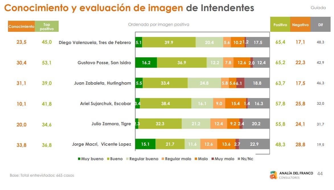 De modo presencial, puerta a puerta, con un total de 665 casos, la consultora midió el conocimiento y la evaluación de imagen de intendentes los jefes comunales, lo que arrojó como resultado que quien mayor imagen positiva tiene es Diego Valenzuela (Juntos por el Cambio), de Tres de Febrero, con un 65,4%.