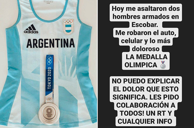 “Hoy me asaltaron dos hombres armados en Escobar. Me robaron el auto, celular y, lo más doloroso, la medalla olímpica”, contó tanto en su cuenta de Instagram como en Twitter. “No puedo explicar el dolor que esto significa. ¡Les pido colaboración a todos!”, añadió.