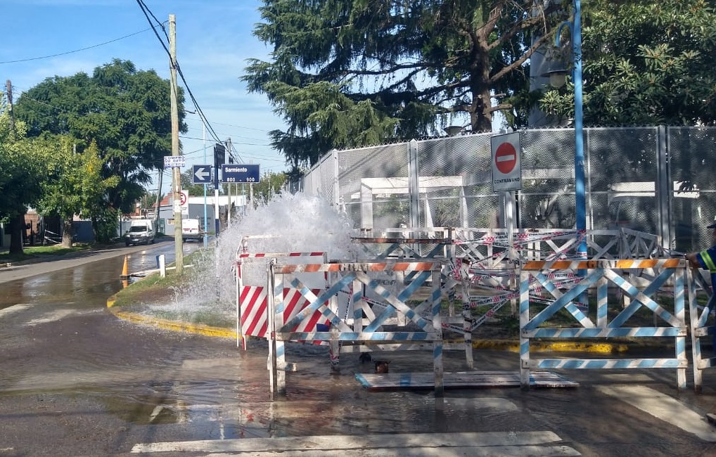 Desde hace unos días, en distintos horarios, es frecuente ver una importante cantidad de agua brotando de una cañería perteneciente a AySA en la esquina de Sarmiento y César Díaz, en Belén de Escobar, justo donde se encuentran la oficina y el emblemático tanque principal de la ciudad.