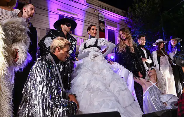 La puesta del evento empezó bien temprano, con todo lo que implicó el armado de una pasarela en la vereda y la calle, más el sistema de luces y sonido, las sillas para los invitados, la grada para el público y demás ornamentaciones. Para peor, la lluvia de la mañana dificultó los preparativos, aunque el sol de la tarde despejó dudas y riesgos.