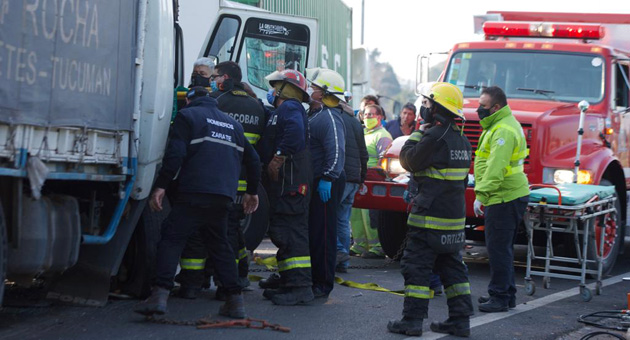 El chofer de uno de los camiones, marca Mercedes Benz, quedó atrapado en la cabina y fue rescatado por bomberos voluntarios, quienes tuvieron que realizar un arduo esfuerzo para retirarlo.