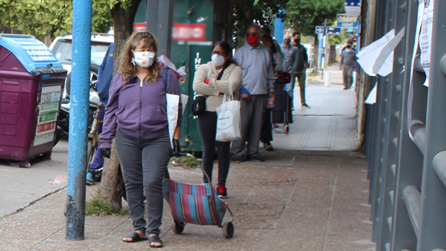 Nuevos hábitos. La fila para el supermercado, con barbijos y respetando la distancia social (Foto: Jeka Ott).
