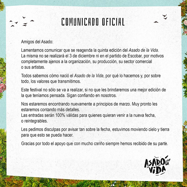 Desde la página de Facebook del festival, a través de un comunicado, se informó que el evento no se llevaría a cabo en el partido de Escobar «por motivos completamente ajenos a su organización, su producción, su sector comercial o sus artistas».