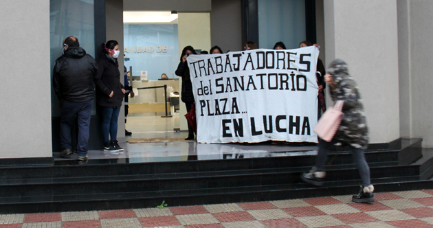 Alrededor de las 10.30, cuatro empleados fueron recibidos por el intendente Ariel Sujarchuk, a quien acompañaron el secretario de Gobierno, Javier Rehl, y el secretario de Salud, Juan Manuel Ordoñez. Los demás se quedaron esperando en la puerta del Palacio Municipal, sosteniendo una bandera blanca con letras negras: «Trabajadores del Sanatorio Plaza en lucha», decía.