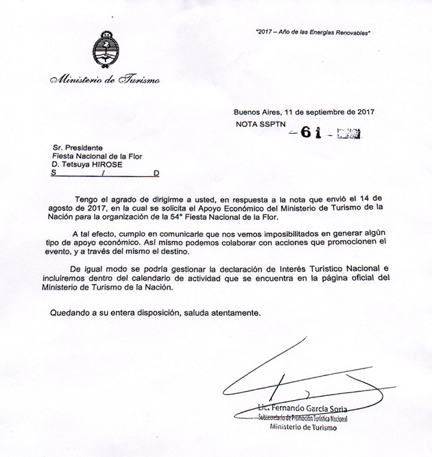 La gestión para solicitar el habitual apoyo estatal para llevar a cabo la exposición nacional de la floricultura se inició formalmente el 14 de agosto. Fue a través de una carta del presidente de la entidad, Tetsuya Hirose, dirigida al ministerio de Turismo de la Nación, a cargo del licenciado José Gustavo Santos, con quien ya había mantenido una conversación al respecto semanas antes. Pero la respuesta estuvo lejos de ser la esperada.