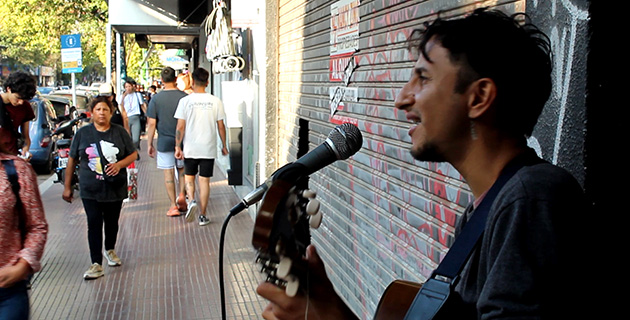 Callejero. Ezequiel Agüero con su guitarra criolla en plena Tapia de Cruz, mientras la gente pasa.
