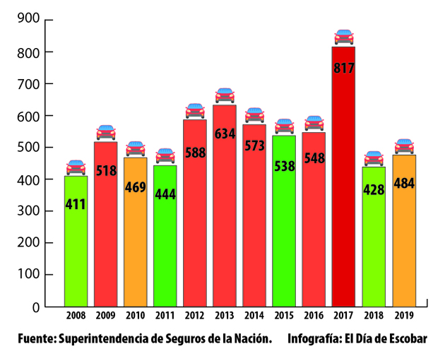 Estos números reflejan un aumento de 13% en comparación a 2018, cuando la cifra total de vehículos sustraídos fue 428 (uno cada 20,5 horas).