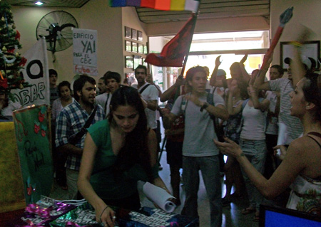 “Nos dijeron que éramos unos irrespetuosos porque estábamos diciendo palabras no apropiadas contra el intendente. Es el colmo, no tienen cara, hace 60 días que estamos esperando una respuesta y nadie hace absolutamente nada”, protestó Sabrina Khran, de la FUBA. También megáfono en mano, otra de las jóvenes agregó: “Nuestras palabras no son impropias, lo impropio es esta gestión, que nos está estafando a todos”.