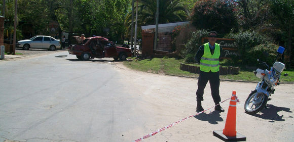 Fuentes consultadas por El Día de Escobar indicaron que el vehículo tuvo un pinchazo en la cubierta delantera derecha, tras lo cual dio un tumbo y golpeó de lleno contra la punta de uno de los dos emblemáticos pilares del acceso principal al barrio parque, que el sábado amaneció conmocionado por el grave suceso.