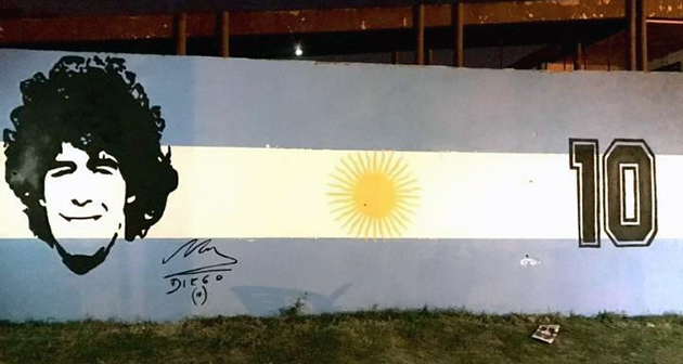 La intervención artística fue realizada sobre un paredón lindero a la Escuela Primaria Nº 34, en el barrio San Miguel. En el margen izquierdo está el rostro de un joven Maradona con la característica melena que lució en los años previos al Mundial de México 1986 y su emblemática firma. A la derecha, el 10 que llevó en la espalda durante su gloriosa carrera. Todo con el fondo de la bandera nacional.