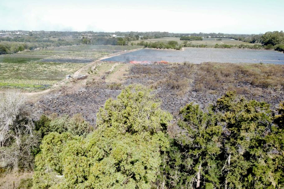 Campo arrasado. Los pastizales quemados y un foco de fuego en el fondo del predio.