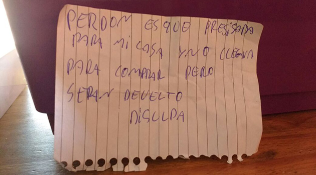 Al abrirlo, se encontró con una nota tan reveladora como insólita: “Perdón es que presisaba para mi casa y no llegava para comprar pero serán devuelto Disculpa (sic)”, eran las palabras textuales del ladrón, confesando el delito y disculpándose con las víctimas.