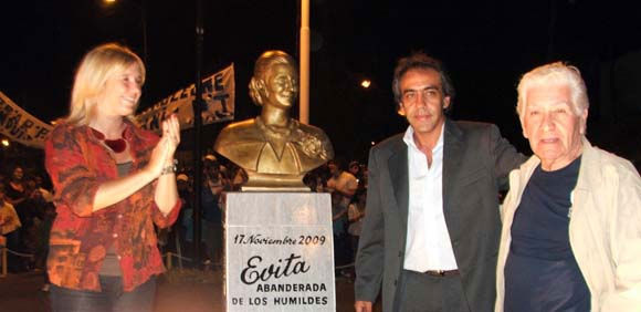 La ministra (sobrina nieta de Evita) y el intendente, junto al profesor Carlos Ruiz, que realizó el nuevo busto.