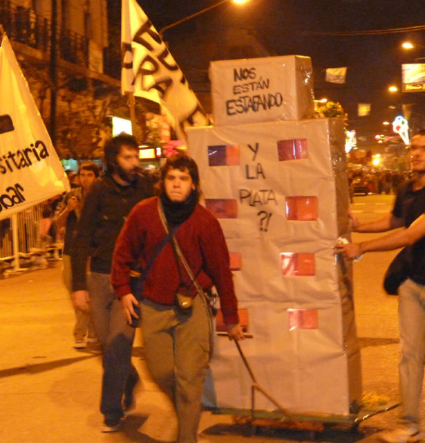 “Edificio Ya para el CBC” exigía un pasacalle sostenido por un chico y una chica. Otra pareja llevaba uno similar que los identificaba: “Comisión Universitaria de Escobar (CUE)”. Y una torre de cartón de dos metros de altura era arriado por tres jóvenes, con duras inscripciones hacia el Municipio: “Nos están estafando. ¿Y la plata?”, acusaba la original maqueta de tamaño humano.
