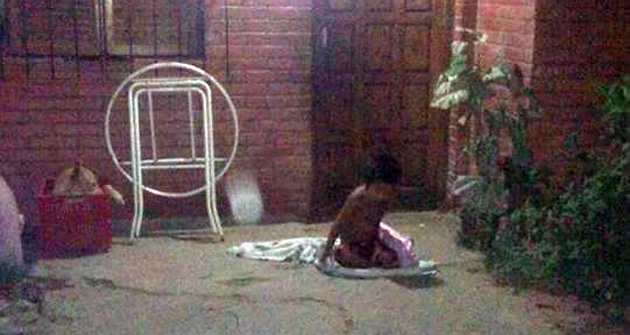 Nene durmiendo a la intemperie de noche y entre las mantas de los perros