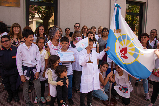 Estandarte. Alumnos y docentes de la Escuela Primaria Nº21 con la nueva bandera de Escobar.