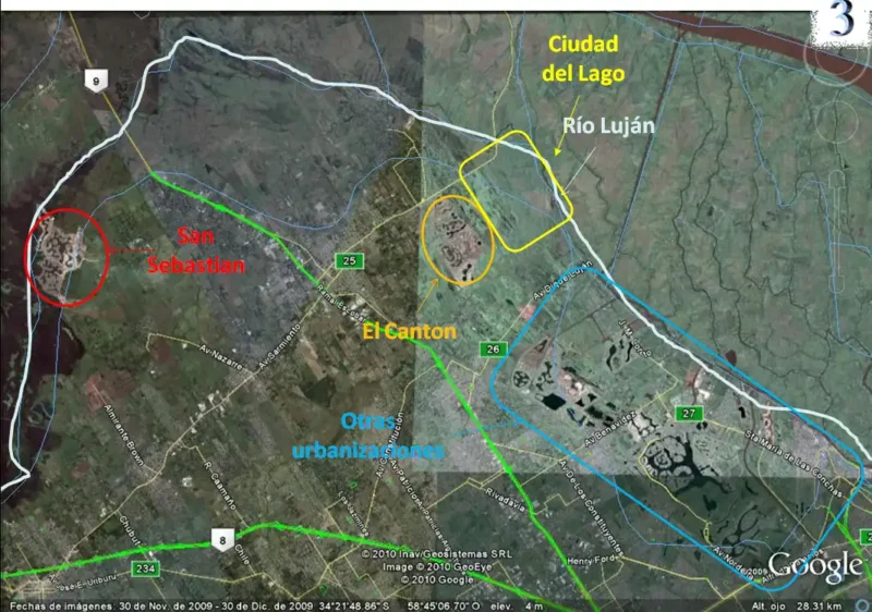 Se mencionan las otras urbanizaciones de estas características de la zona, en relación a que avanza la frontera de este tipo de urbanizaciones, como algo positivo, sin llegar a ver cuál es la sinergia de todos estos emprendimientos. No se está considerando que una gran mayoría están asentados en la llanura de inundación del Río Luján.