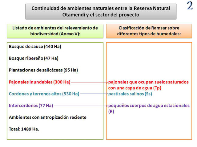 En el Estudio de Impacto Ambiental se desprecia la pérdida de esta superficie de humedales dentro del predio por corresponder a una pequeña parte del gran humedal que conforma la ecoregión Delta e Islas del Paraná. Sí se afirma que el humedal de este predio tiene continuidad con el gran humedal del Delta.