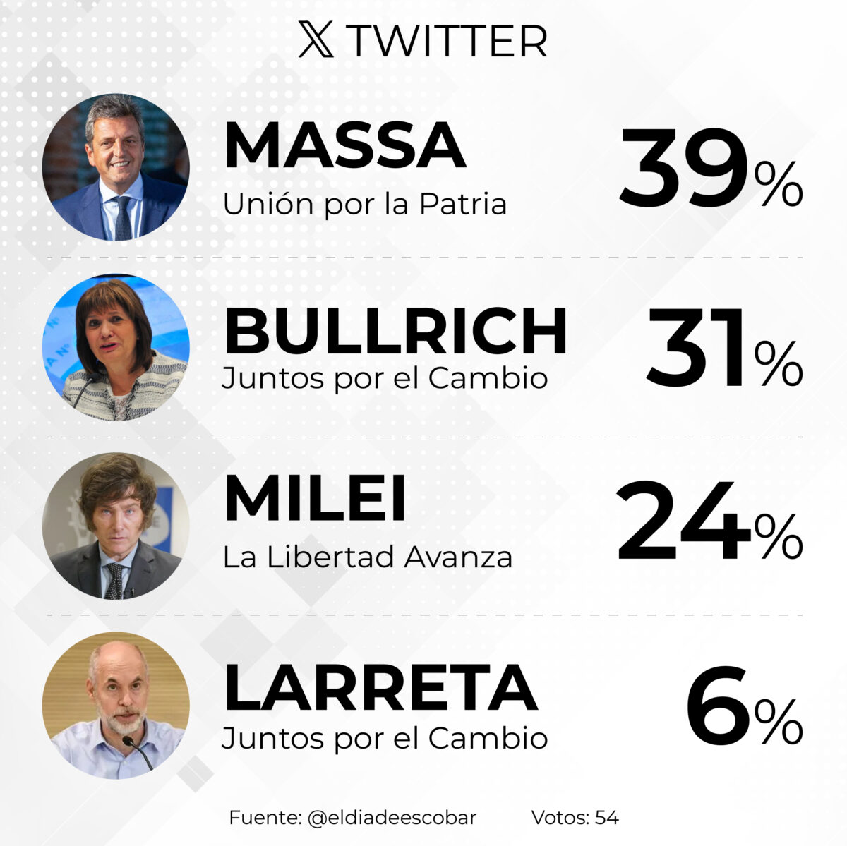 El precandidato presidencial más votado en Twitter fue Sergio Massa, de Unión por la Patria. El ministro de Economía de la Nación obtuvo el 39% de los votos. El segundo lugar fue para Patricia Bullrich, de Juntos por el Cambio, con el 31% de las adhesiones.