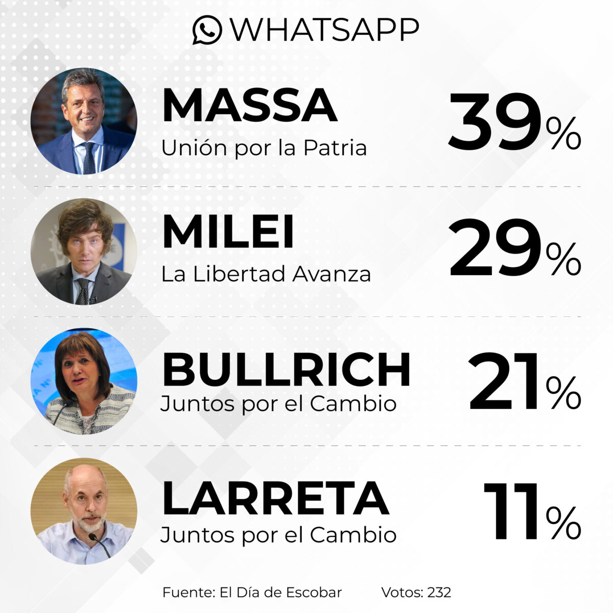 En WhatsApp el ganador fue el mismo. Curiosamente, Sergio Massa repitió el 39% que consiguió en la ex red del pajarito. El segundo lugar, en cambio, fue para Javier Milei, con 29%.