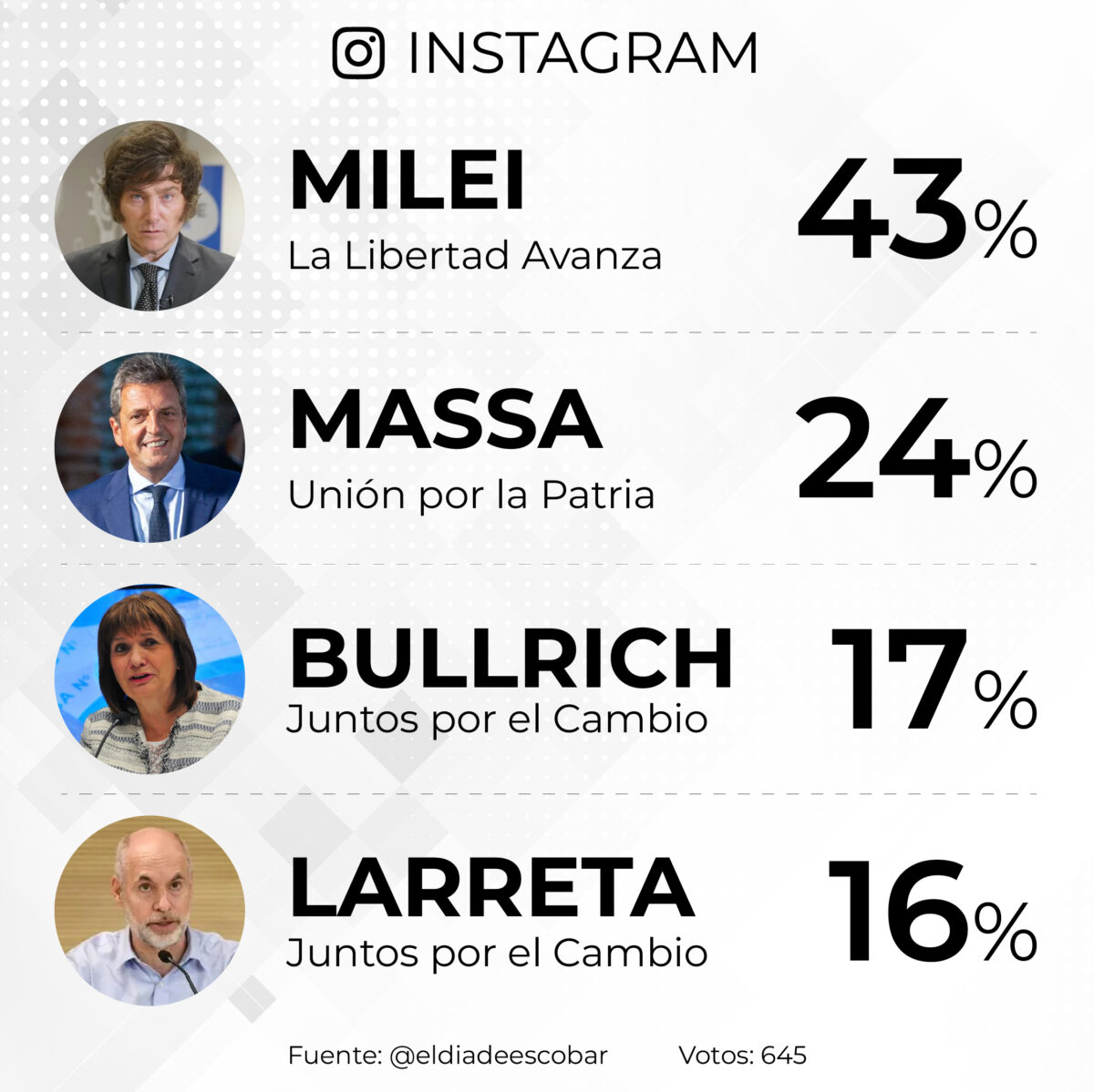 Por último, la encuesta en Instagram arrojó un resultado muy distinto. En principio, el ganador no fue Massa sino Milei, que logró el nivel de simpatías más alto, con 43% de los votos, y también la mayor diferencia respecto al segundo.