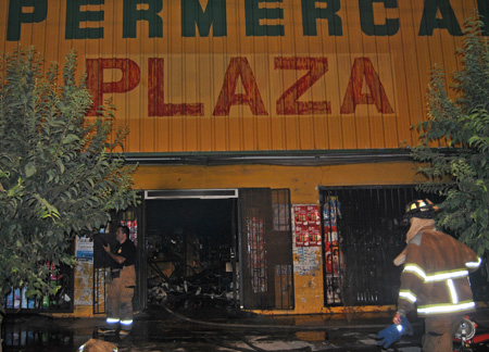 Seis dotaciones de bomberos, de Garín y Benavídez, se hicieron presentes en el supermercado “Plaza”, ubicado en la esquina de 2 de Abril y boulevard Perón, donde las llamas llegaron a alcanzar una altura de diez metros de alto y consumieron todo a su paso.