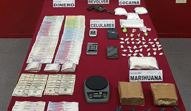 Decomiso. Billetes de diversa denominación, envoltorios con cocaína y marihuana, celulares y un revólver.