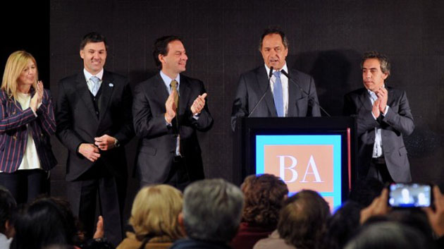 En su alocución, Scioli evitó referirse a la situación política local, aunque la ubicación de Sujarchuk escoltándolo a su derecha fue interpretada como una señal de que el funcionario del Ministerio de Desarrollo Social es quien cuenta con el aval oficial para pelear por la Intendencia.