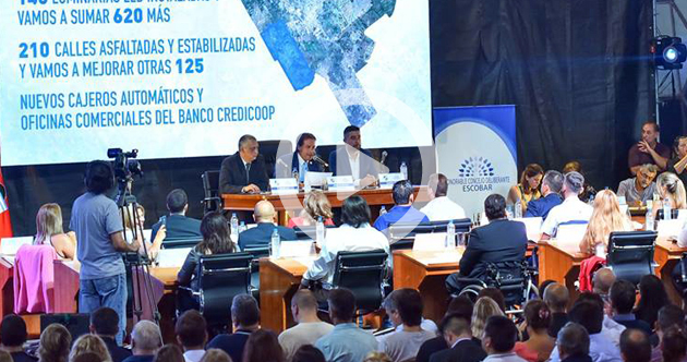 Mientras él hablaba, una enorme pantalla colocada a espaldas del estrado pasaba placas con gráficos e imágenes alusivos a cada ítem. Así, por ejemplo, expuso un listado en el que Escobar está al tope de la tabla de municipios que más aumentaron la coparticipación provincial, con un 40% en los últimos tres años. «Esto es gestión y hacer bien la tarea», remarcó.