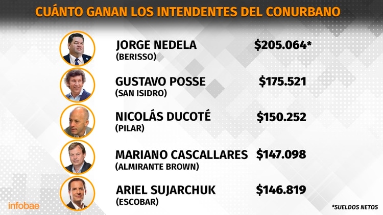 El relevamiento lo encabeza el intendente de Berisso, Jorge Nedela (UCR-Cambiemos), quien declaró en 2017 un sueldo mensual neto de $205.064. Lo siguen Gustavo Posse, de San Isidro (UCR-Cambiemos), con $175.521, y Nicolás Ducoté, de Pilar (PRO), con $150.252.
