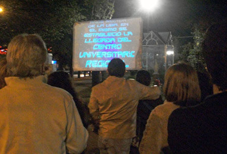 Fue en la plaza San Martín, a la noche, donde instalaron una pantalla gigante para exhibir a la comunidad un documental elaborado por ellos mismos sobre la intrincada historia de la UBA en el distrito. En esa recorrida, abundaron humoradas y testimonios sobre los primeros conflictos con el entonces intendente Luis Patti y los actuales con la gestión de Sandro Guzmán.