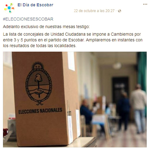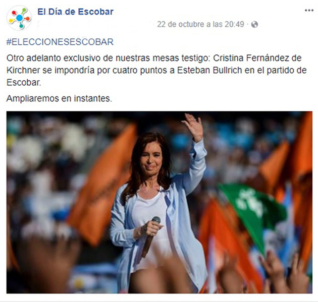 Pero eso no fue todo. También a las 20.30, El Día de Escobar adelantó que Cristina Fernández de Kirchner “se impondría por 4 puntos a Esteban Bullrich”. Efectivamente, no sólo que la ex presidenta ganó en el distrito sino que la brecha con Cambiemos fue de apenas 2.2%.